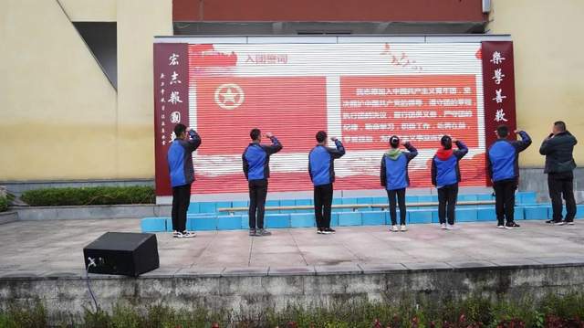 新团员徐徐入场,学校团总支书记苏晗带领团员为新团员佩戴团徽,德育处高亮主任带领新团员进行入团宣誓。