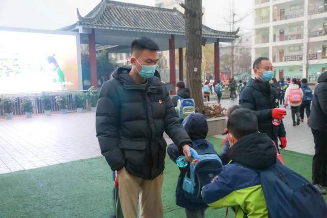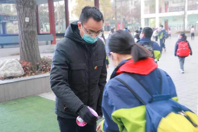 每天清晨,天还蒙蒙亮,党员同志就早早来到学校。校门口,他们迎着寒风,认真有序地对每个进校门的师生开展体温检测,守护好校园安全的第一道关卡。