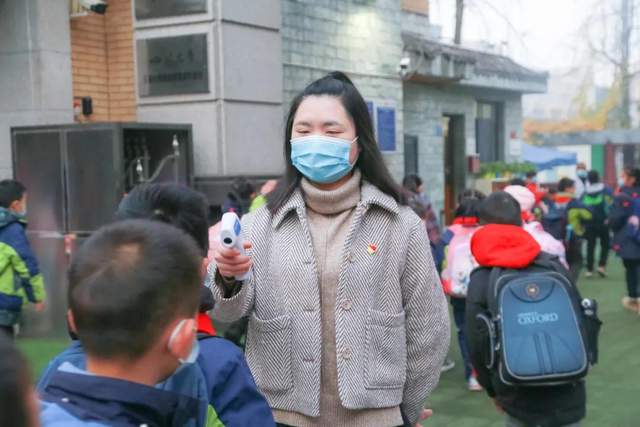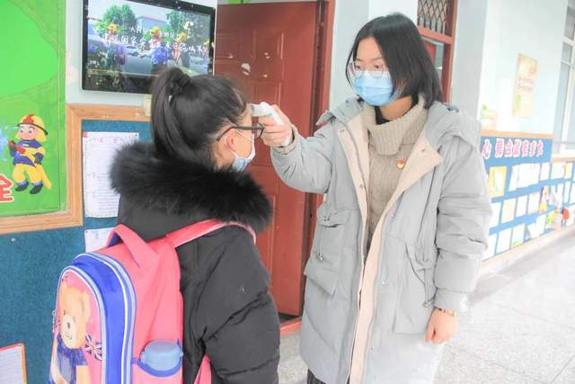班级门口,党员教师们再次对班级学生进行体温监测,同时还会进行出行询问,对每一个孩子的健康状况作进一步的了解和掌握。