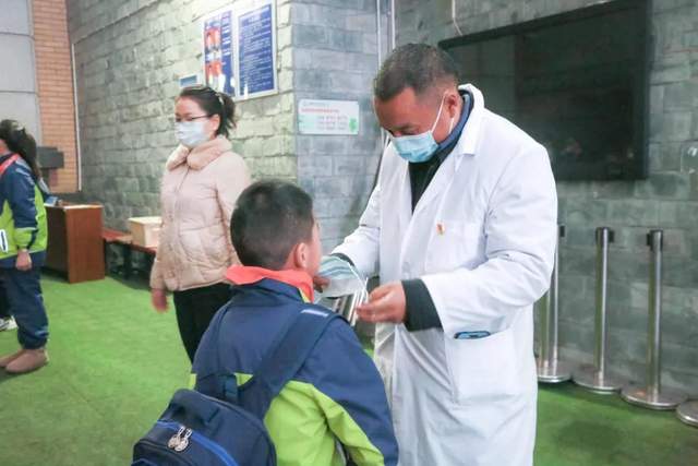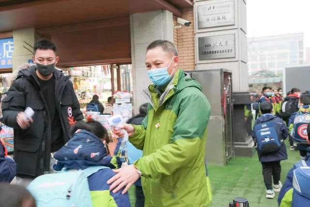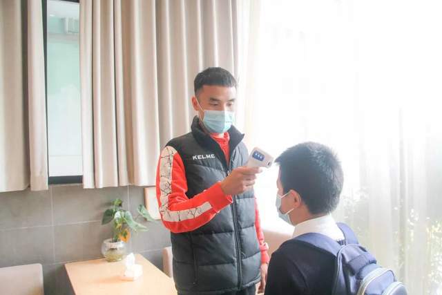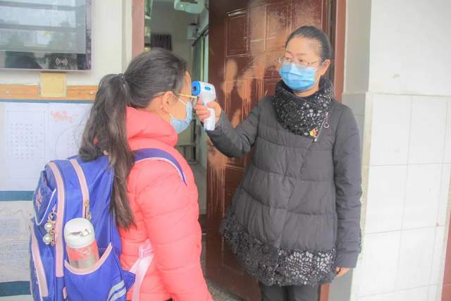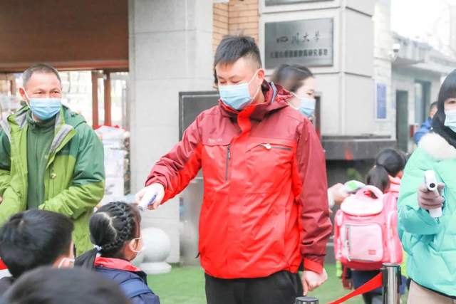 党员同志们对师生们一一进行体温检测全力保障师生身体健康