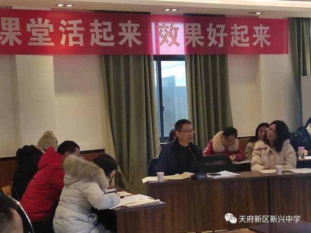 然后,学校在大会议室组织了一场“精实教育沙龙”,老师们及与会专家、领导们进行深度交流。沙龙流程有四大环节,一是由新兴中学党支部书记、校长高贞富从“精实课堂”的顶层设计进行了讲解,提出了“精实课堂”要义的32字;二是由学校副校长余杰带领教务处人员对“精准目标,实操研习”、“精准设问,丰实思维”、“精准练习,实用高效”、“精准反馈,扎实生成”逐一解读。三是教师发表对“精实课堂”理解的个人见解,新兴中学语文组江君老师诉说了对“精”的理解,理化生组刘思雯讲解了对“实”的独特见解。四是专家点评及建议。双流区英语教研员、特级教师程德金提出:在英语教学中,围绕“精实课堂”,采用“精”的手段,实现“实”的目标,处理好问题与思维的关系,语言与思维的关系,达到提升学生对英语“音形”的理解,提升学生的思维。天府新区数学教研员、特级教师刘兵,则认为:复习课根据精准目标分为小专题复习及章节复习,复习课的重难点必须抓到核心要点;精准练习的方法,推荐采取一题讲到底(一题多变),凸显重要的数学思维方法,或一法讲到底。随后,新兴中学老师们就教学中实实在在出现的问题,与专家们进行了互动交流。老师们真实性的问题,专家给予的可行性措施,让老师们受益匪浅。然后,教体处督导室主任刘华锦对本次活动给予了高度的评价,他指出,学校变了、教师精神面貌变了、学生也更自信了。