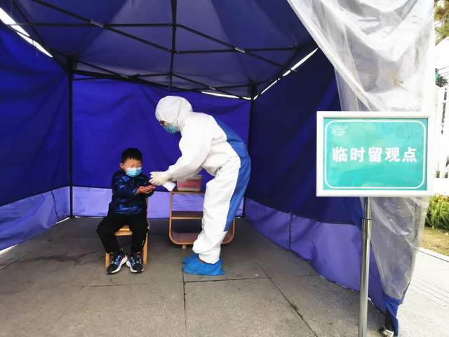 保健医生在隔离观察点对发热幼儿复测、询问流调,启动应急预案。