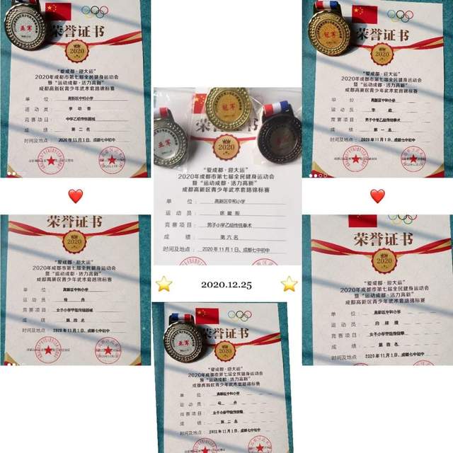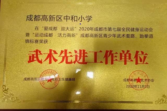在“爱成都·迎大运”2020年成都市第七届全民健身运动会暨“运动成都·活力高新”成都高新区青少年武术套路、跆拳道锦标赛中荣获金牌12枚、银牌6枚、铜牌6枚,同时成都高新区中和小学也荣获“武术先进工作单位”称号。这一张张荣誉证书,一块块沉甸甸的奖牌,凝聚着教练的辛勤栽培,也汇集了孩子们的努力与汗水。