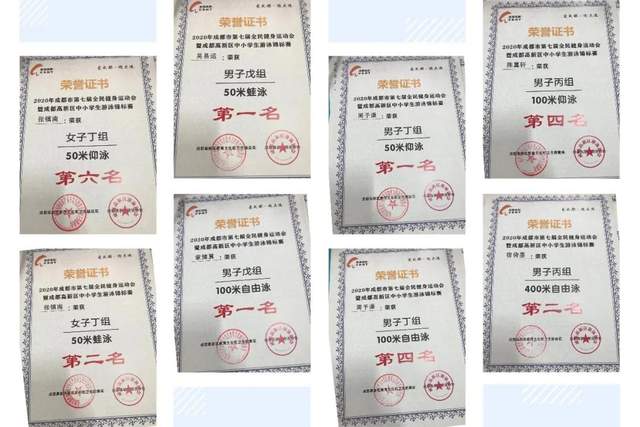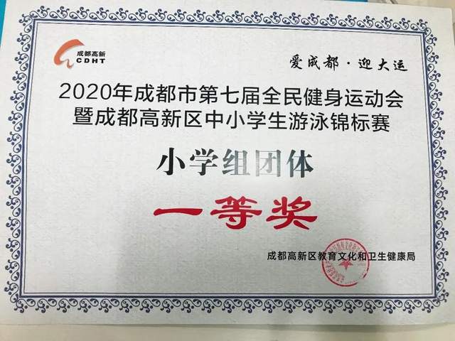 10月20日,在“爱成都,迎大运”2020年成都市第七届全民健身运动会暨成都高新区中小学生游泳锦标赛中,成都高新区中和小学游泳队不断超越自己,奋力拼搏,获得优异成绩:章博翼荣获男子戊组50米自由泳第一名和男子戊组100米自由泳第一名;张镇南荣获女子丁组50米蛙泳第二名和女子丁组50米仰泳第六名;周予谦荣获男子丁组50米仰泳第一名和男子丁组100米自由泳第四名;吴易运荣获男子戊组50米蛙泳第一名;;陈翼轩荣获男子丙组100米仰泳第四名;宿倚墨荣获男子丙组400米自由泳第二名。