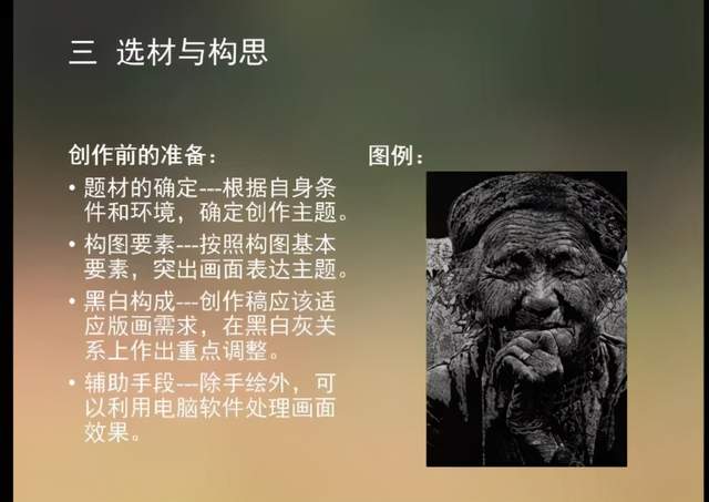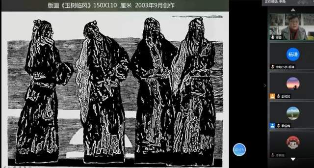 选材与构思方面,李老师从题材的确定、构图要素、黑白构成、辅助手段几方面给予了指导意见,为老师们的创作提供了有效思路。并详细介绍了画稿如何上版、刻版与拓版、参展作品的署名装裱及运输等。