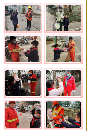 “爷爷奶奶,你们辛苦了,敬礼!”,孩子们右手举过头顶,用标准的队礼向环卫工人致敬,并送上豆浆和鸡蛋。正是因为有了环卫工人、保洁员每天起早贪黑、不计辛劳,我们才能够在干净整洁的城市环境里为实现伟大的“中国梦”努力学习、奋力拼搏。