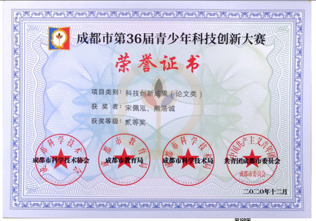 许国贞老师指导三年级宋佩泓、熊浩诚撰写的科技论文《七色花染制方法研究》,喜获成都市二等奖,同时获得2020天府新区青少年科技创新大赛一等奖。