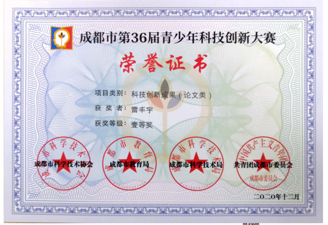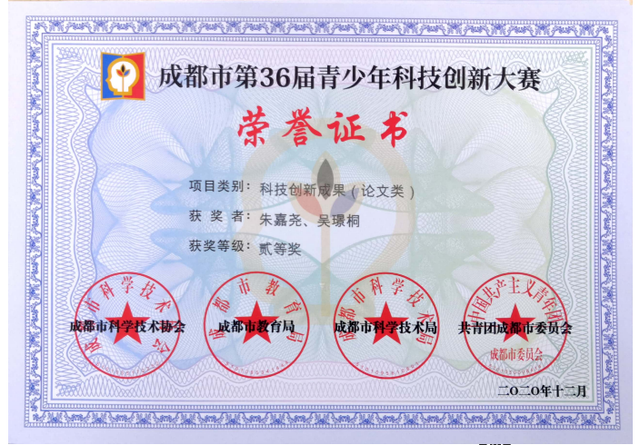 张颖老师指导一年级朱嘉尧、吴璟桐撰写的科技论文《杯中彩虹实验探究》,喜获成都市二等奖,同时获得2020天府新区青少年科技创新大赛一等奖。