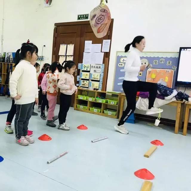 接着是邱怡凡老师带来的大班室内运动《运粮》,通过游戏“运粮”—“搬粮”—“保卫粮食”三个层层递进的游戏,幼儿掌握了双脚夹物跳的技能,发展了幼儿下肢弹跳能力。