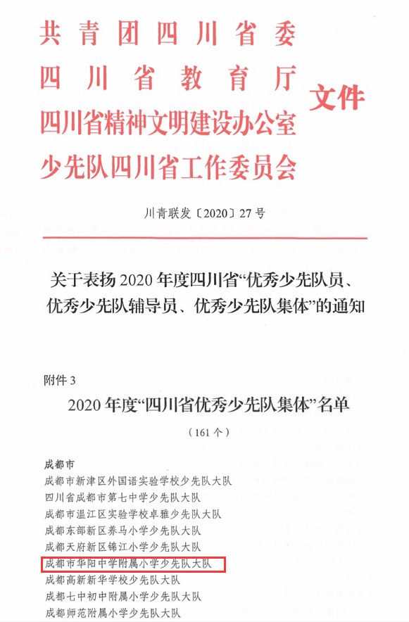 2020年11月,在共青团四川省委、四川省教育厅、四川省文明办、四川省少工委联合下发《关于表扬2020年度四川省“优秀少先队员”“优秀少先队辅导员”“优秀少先队集体”的通知》中,成都市华阳中学附属小学大队部荣获“四川省优秀少先队集体”称号。