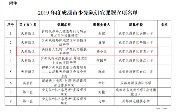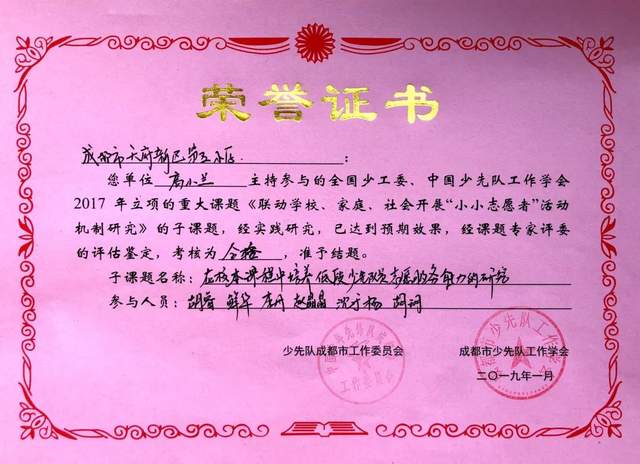 成都市教育局“新冠肺炎疫情与成都教育应对”专项课题《疫情防控背景下少先队主题教育方法与策略研究》结题。