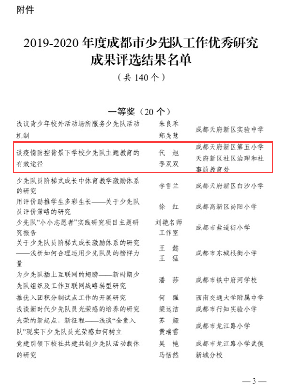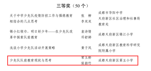 在成都市少先队工作优秀研究成果评选中,代旭老师所撰写的论文《谈疫情防控背景下学校少先队主题教育的有效途径》,获成都市一等奖。常玉娇、侯韵竹老师所撰写的论文《少先队队前教育现状与思考》,获成都市三等奖。