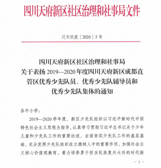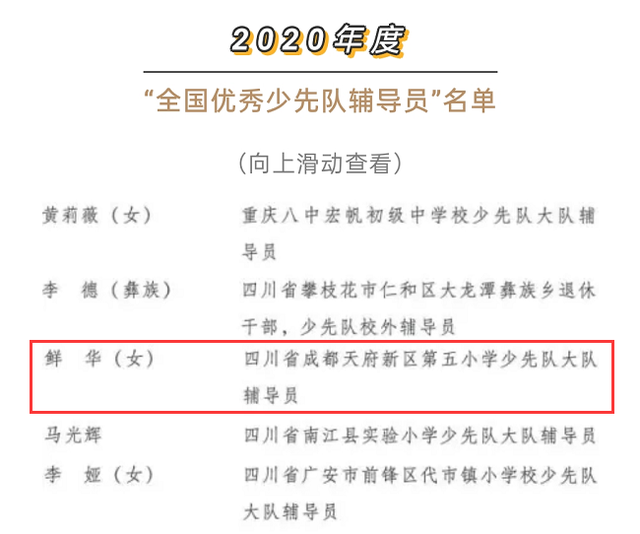 2020年12月,共青团中央、教育部、全国少工委联合下发《关于表彰2020年度“全国优秀少先队员”“全国优秀少先队辅导员”“全国优秀少先队集体”的决定》。华中教育集团小学集团部(现天府三中附小校长助理兼大队辅导员)鲜华荣获“全国优秀少先队辅导员”称号。
