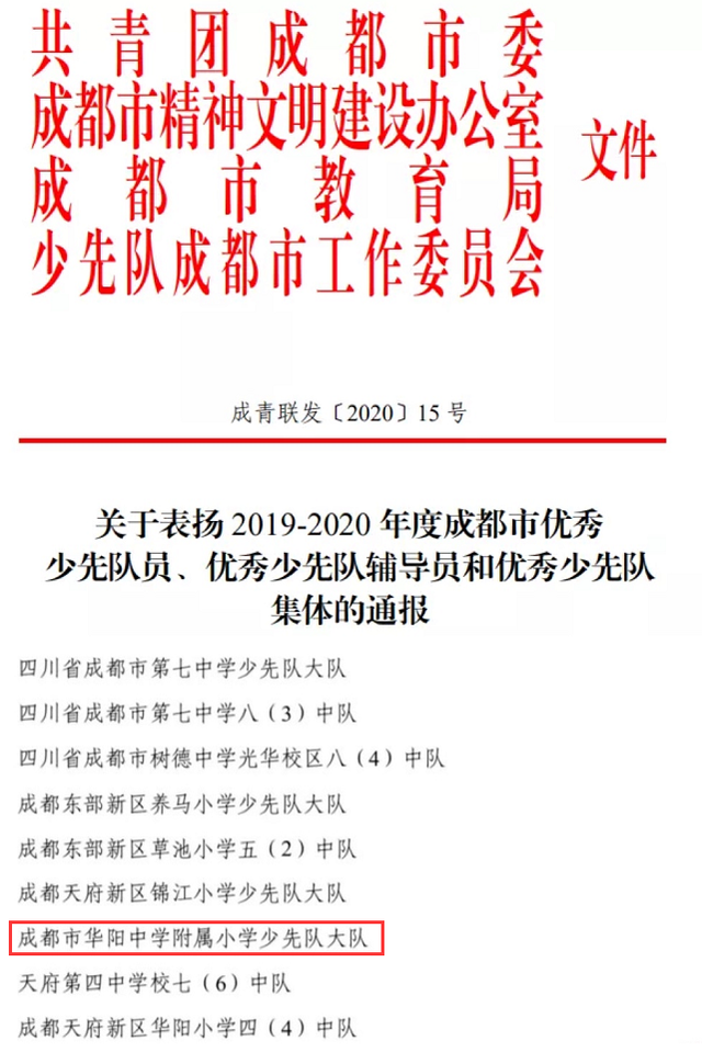 在共青团成都市委委、成都市文明办、成都市教育局、成都市少工委联合下发《关于表扬2019-2020年度成都市“优秀少先队员”“优秀少先队辅导员”“优秀少先队集体”的通知》中,成都市华阳中学附属小学大队部荣获“成都市优秀少先队集体”称号。