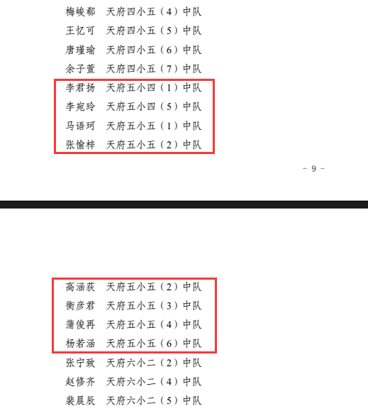天府五小五(4)中队、五(6)中队,华中附小三(4)中队荣获“天府新区优秀少先队集体”称号;华中附小辅导员田玉婷,天府五小辅导员代旭、杨钰婷荣获“天府新区优秀少先队辅导员”称号;天府五小蒲俊再、华中附小祝梓萱等少先队员,荣获“天府新区优秀少先队员”称号。
