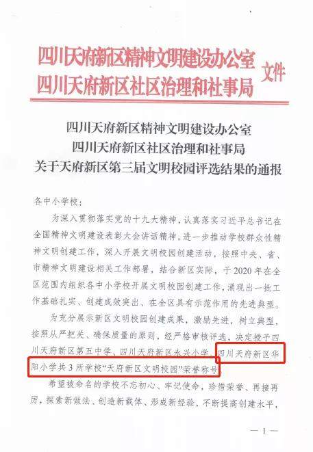 四川天府新区华阳小学校被评为“天府新区文明校园”