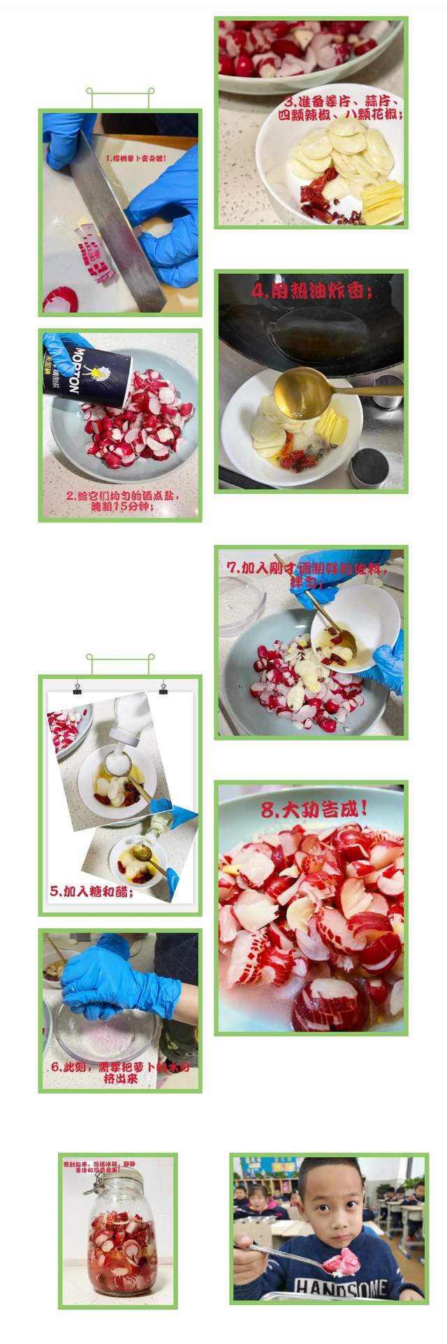 孩子们把一颗颗小萝卜带回家,与家长分享劳动喜悦的同时,也对可爱的萝卜进行加工,变成了一道道美食。有把萝卜洗净切块儿直接下锅煮着吃的,有把萝卜切成丝炒着吃的,有把萝卜风干做成萝卜干的。