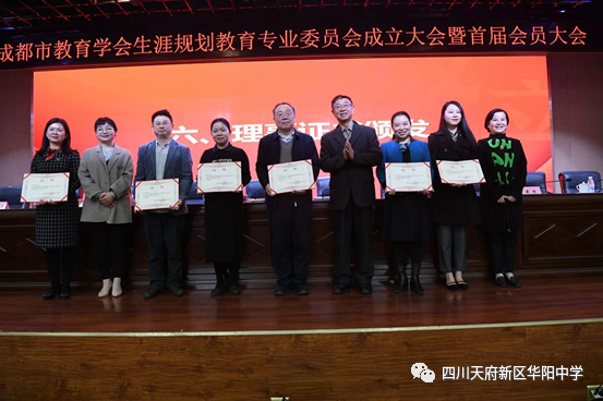 成都市教育学会会长王志坚,成都市教育学会副秘书长胡燕,成都市教育局普教处王妍为第一届理事会颁发理事证书。华阳中学心理教研室主任陈碧华当选为首届专委会理事。