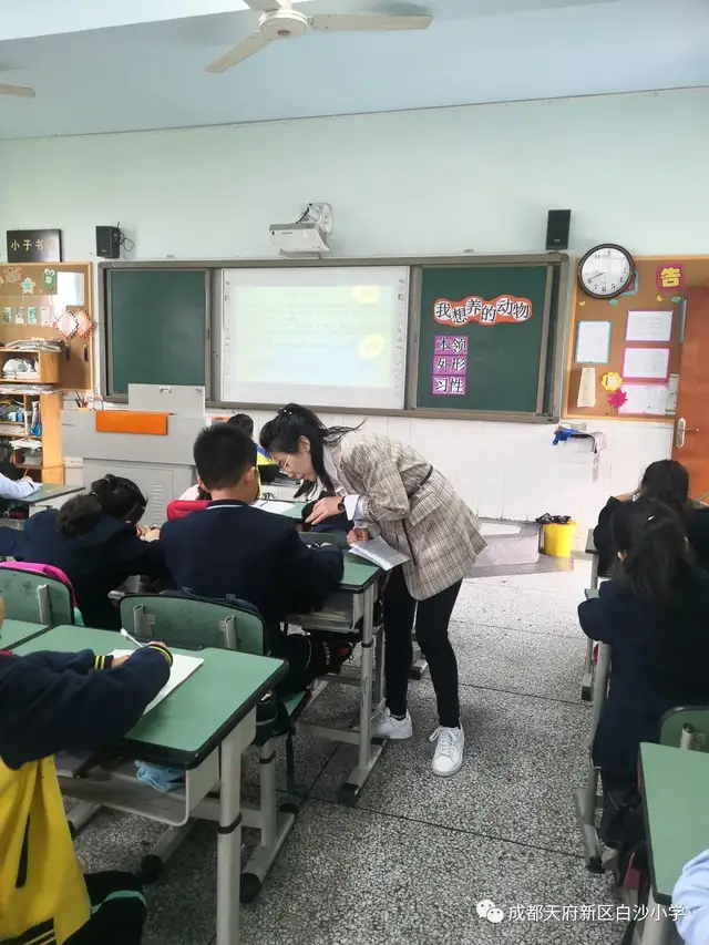 首先,邓培老师执教二年级下册第七单元写话课《我想养小动物》。邓老师通过播放关于小动物的视频,激发学生学习的兴趣;通过提问,让学生知道写话该写些什么;再出示例子,给学生构建写作的支架。学生写完以后,通过评价量表进行评价,使学生不仅学会写,还学会评。