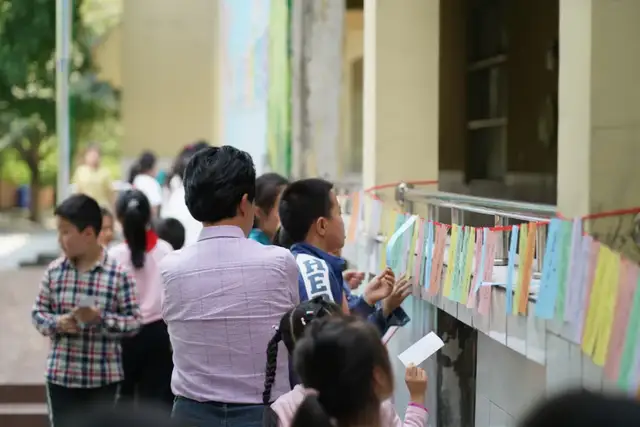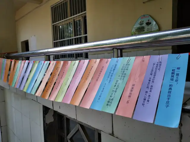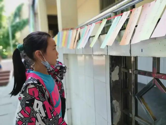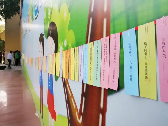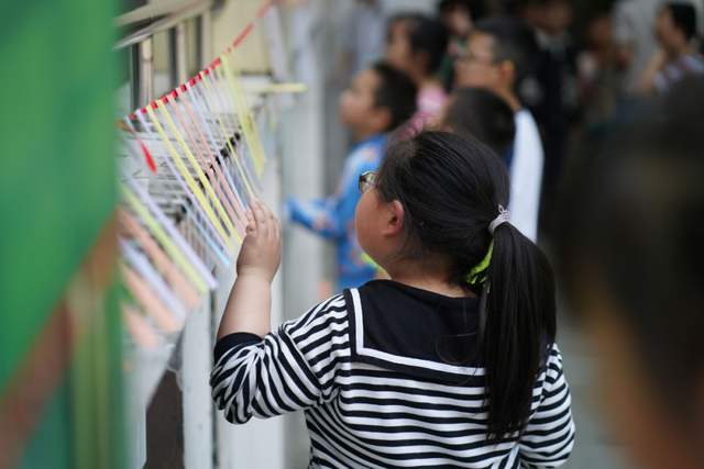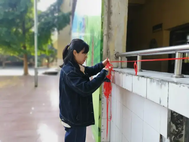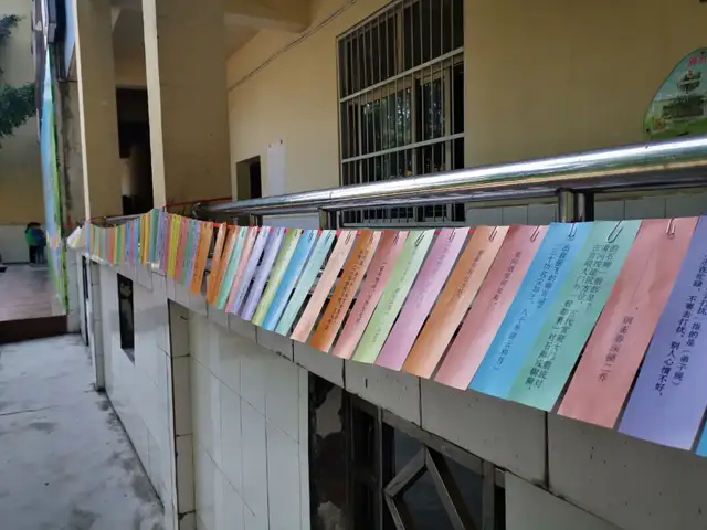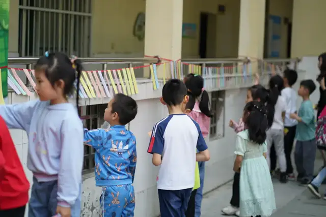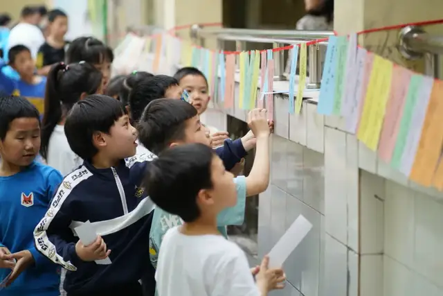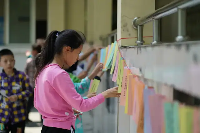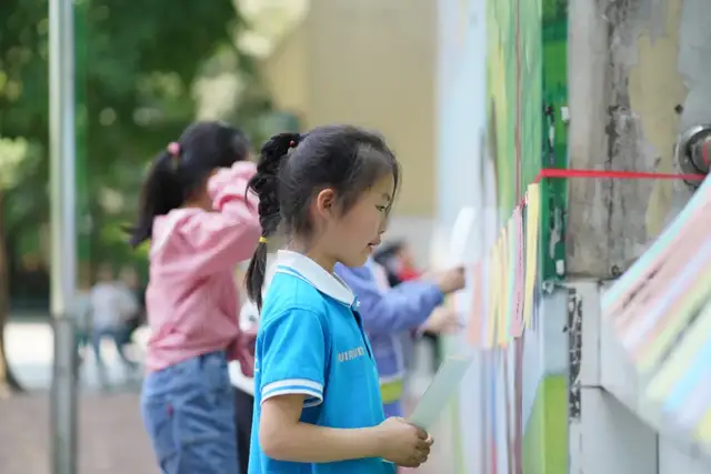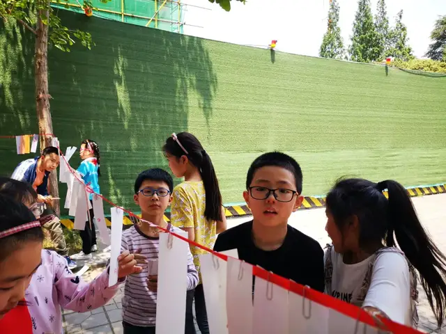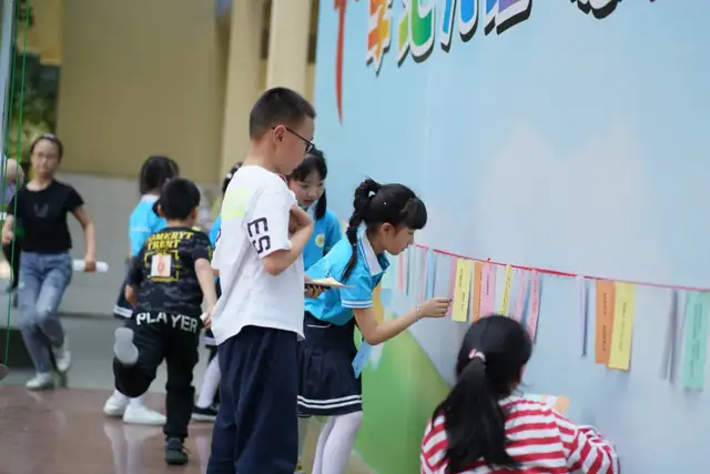 一早,老师们就忙着布置会场。一会儿工夫,上面写着各种题目的纸条就挂满了校园,红红绿绿,煞是好看,成为了学校一道靓丽的风景!