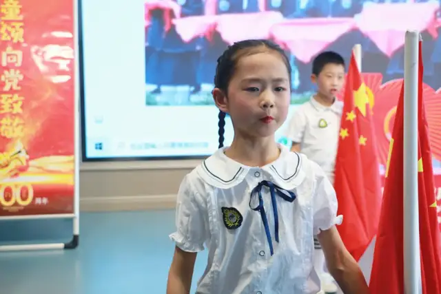 首先出场的是一年级7班的队伍带来的《党是阳光,我是花》。我们的队旗高高飘扬,指引我们前进的方向。鲜艳的红领巾向着阳光,祖国花朵在党的养育下成长。党是阳光我是花,党的恩情永不忘。