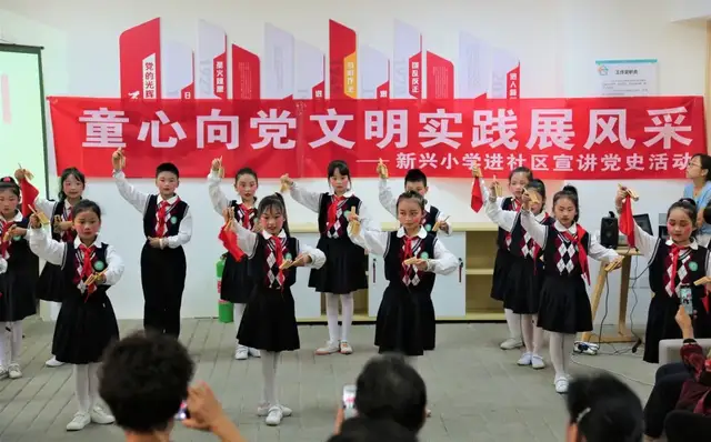 四川行知教育网讯:百年初心历久弥新,中国共产党的百年征程是一部丰富生动的教科书。习近平总书记在党史学习教育动员大会上强调:“回望过往的奋斗路,眺望前方的奋进路,必须把党的历史学习好、总结好,把党的成功经验传承好、发扬好。”5月19日上午,四川天府新区新兴小学三年级同学深入社区,以丰富的形式、精彩的内容进行了党史宣传,赢得了社区人民的阵阵掌声。