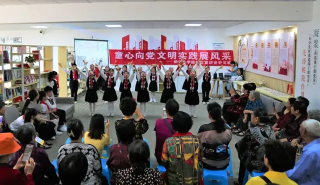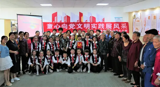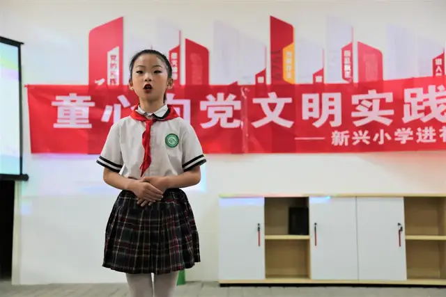 共产党像太阳,照得大地多辉煌。三一班和三三班的同学向社区群众进行了《童心向党》快板表演。表达了对共产党深切的热爱之情。