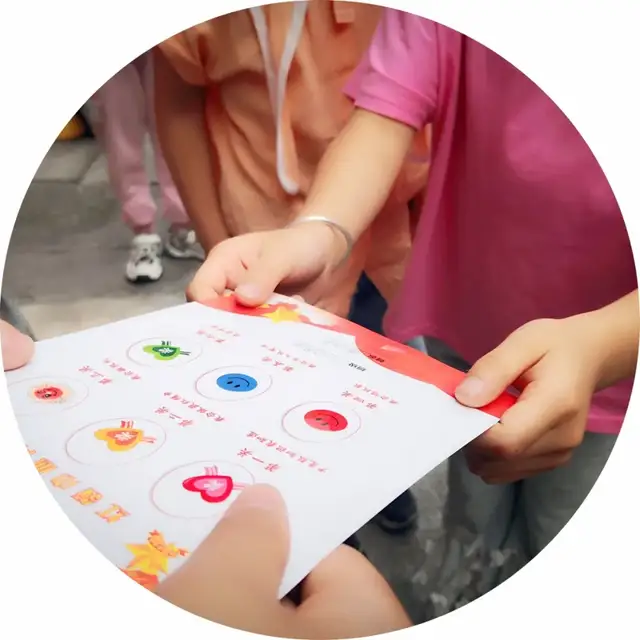 一年级的孩子们手持闯关卡奔跑在各个关卡之间。胜利闯过一关,获得一枚stike。