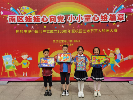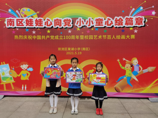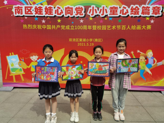 四川行知教育网讯:为迎接中国共产党成立100周年,宣传党百年来取得的辉煌成就,进一步在校内营造庆祝建党100周年浓厚氛围,成都市双流区棠湖小学(南区)于2021年5月19日举办了以“南区娃娃心向党 小小童心绘篇章”为主题的百人绘画大赛的活动。