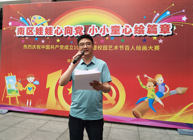 李春校长莅临百人绘画大赛现场致词,鼓励南区娃娃们用灵巧的双手、心灵的色彩为党为国添彩。并教育孩子们要“不忘初心、牢记使命、担当有为,砥砺前行”。