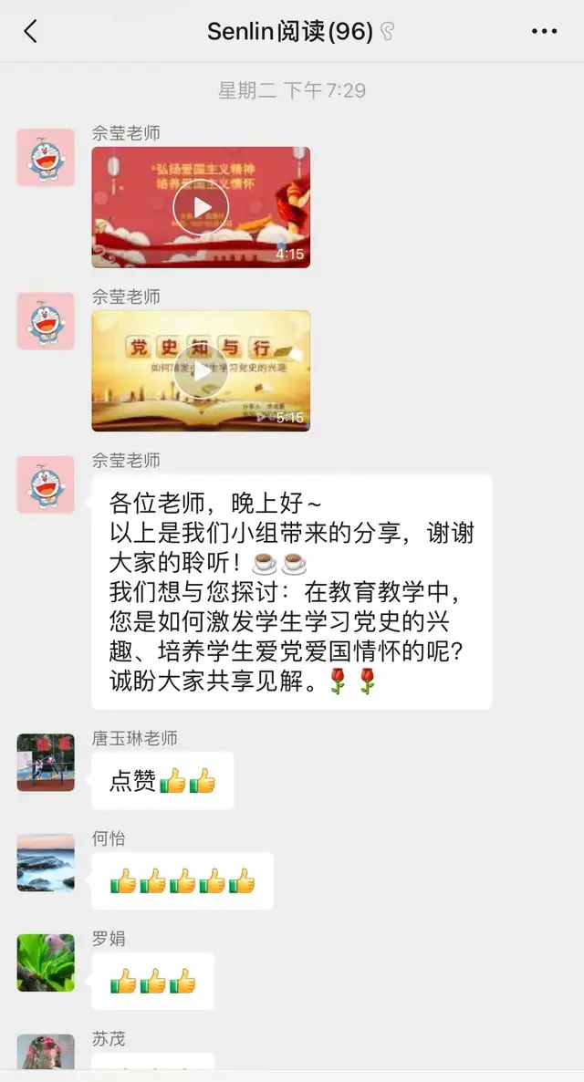 本次活动由佘莹老师主持,杨清月老师在视频中分享到培养爱国情怀的具体方法,并推荐了阅读书籍;李成霞老师认为我们激发学生学习党史的兴趣需要“知与行”。