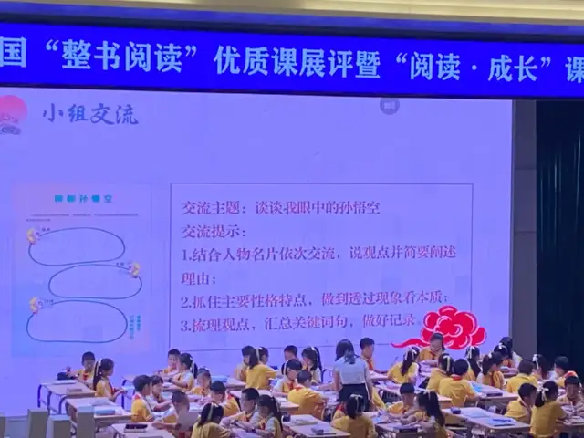 第二节课是由龙泉五小的魏阳莉老师和五年级的孩子们带来的《西游记》。这本家喻户晓的书,被魏老师上出了别样的趣味。魏老师通过课前调查,发现孩子们眼中的《西游记》竟然很无趣,原因大致分为三点:内容多,故事雷同;内容不新鲜;与影视剧相比,没有画面感。为此,魏老师设计了三个学程,以期换回孩子们的兴趣。在第一学程中,魏老师设问:在你眼中,孙悟空是怎样的?孩子们纷纷根据文本内容制作了属于孙悟空的人物名片。在梳理、交流的过程中,魏老师带领孩子们总结出以下抓住人物形象特点的法宝:抓典型特征、品精彩片段、画情节发展、抓重要线索等等。读经典名著,品百味人生,期望孩子们开启更多的阅读之旅。