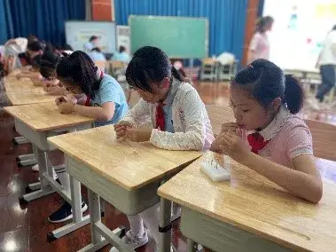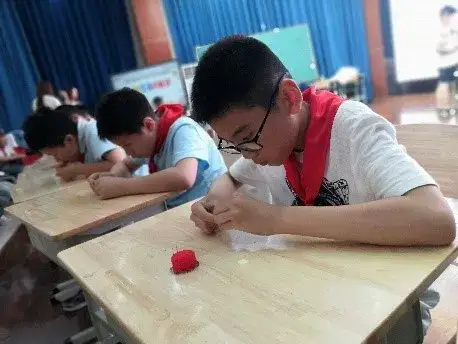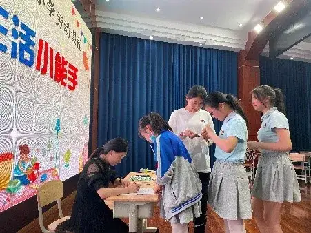六年级的难度再次升级,他们需要在五分钟内以十字交叉法缝制4颗四孔纽扣。原以为这个项目会难倒很多孩子,结果却出乎意料,孩子们捣鼓起针线来是游刃有余,得心应手呢!