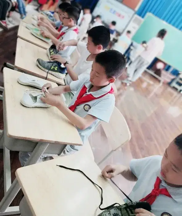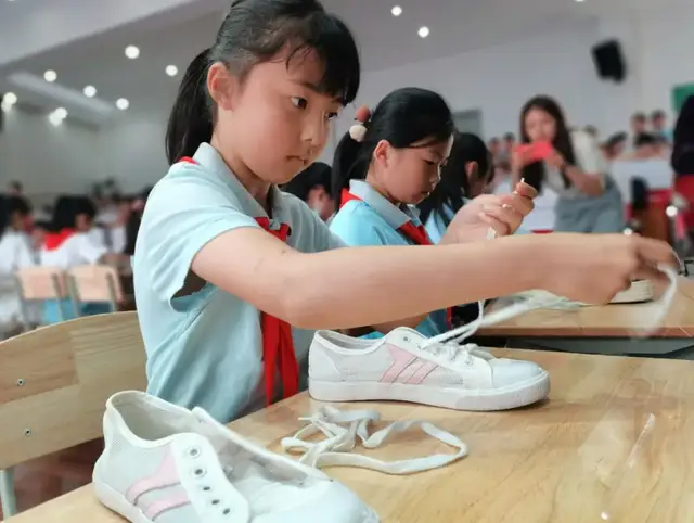 四年级的选手比赛难度相对升级,他们要挑战的是系鞋带。选手们自行准备一双干净的需要系鞋带的运动鞋(单只鞋面上至少有8个孔),比赛时鞋带至少要穿过8个孔,且最后要系上正确的活结,才算挑战成功。