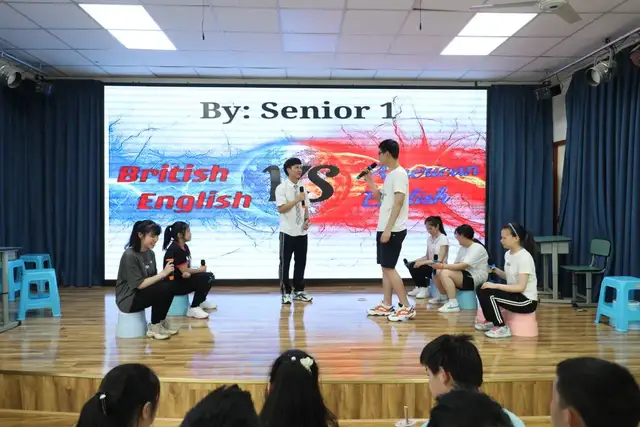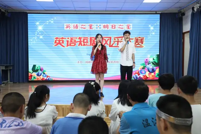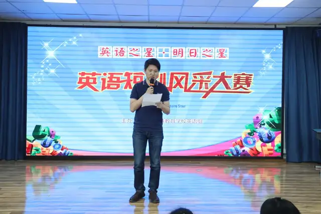 隆重介绍,大赛的双语主持:女主持是内外兼修的普高二年级高尚同学,男主持是才华横溢的普高一田中其同学。